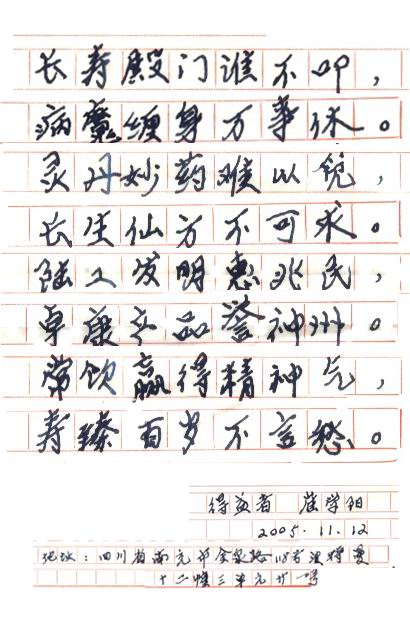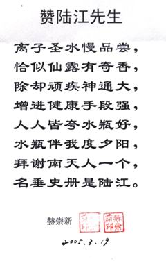 凡尊重中國(guó)古代養(yǎng)生智慧的患者,堅(jiān)持“已饑方食”和定時(shí)主動(dòng)補(bǔ)水者,均可祛病康復(fù)。如牡丹江醫(yī)學(xué)院87歲的張鵬圖飲用半年后高血壓未痊愈,陸江與他通話(huà)交流,了解他原先每日主食4兩,建議他用“已饑方食”減少主食肉食量,他理解后,將每日主食減為3兩,少吃?xún)蓧K肉,飲用一年治愈26年的冠心病和高血壓。他2003年5月31日來(lái)信說(shuō):“飲用卓康小分子團(tuán)水是根治高血壓、冠心病、糖尿病的一把金鑰匙,是填補(bǔ)醫(yī)學(xué)空白,為人類(lèi)造福,應(yīng)推廣該產(chǎn)品?!?/strong>