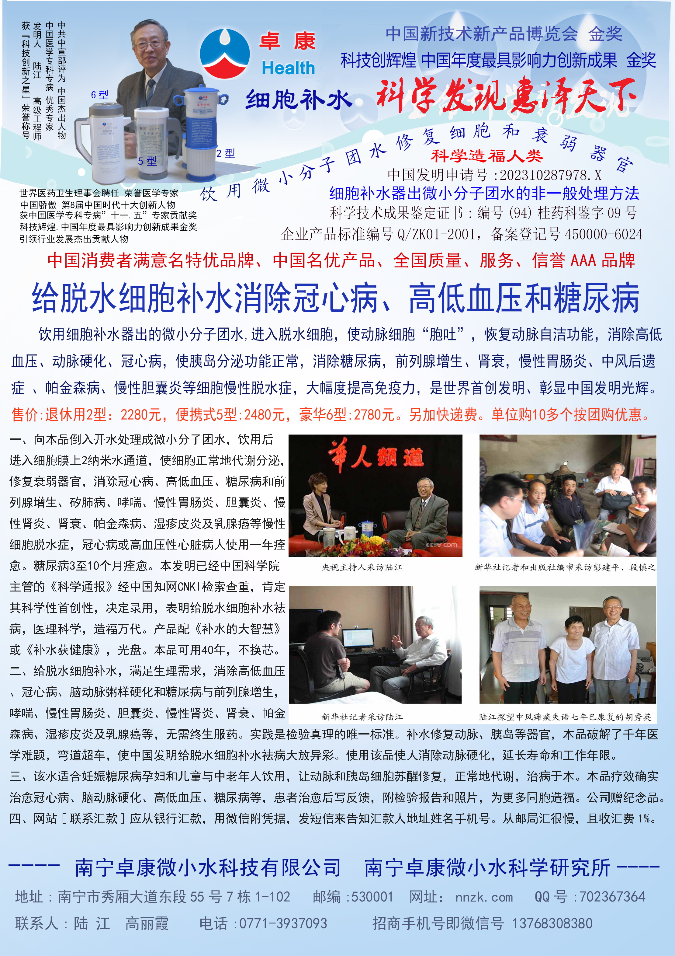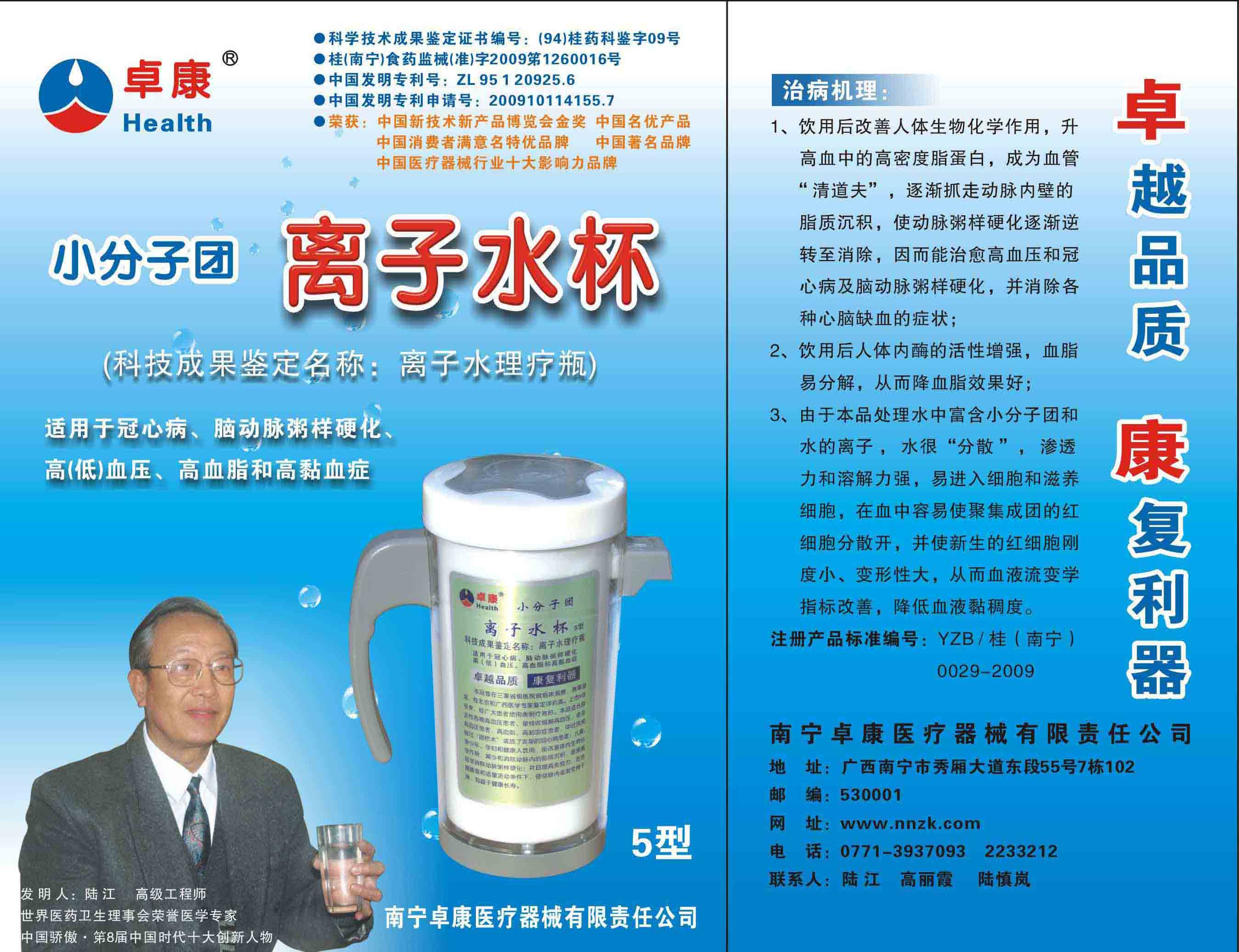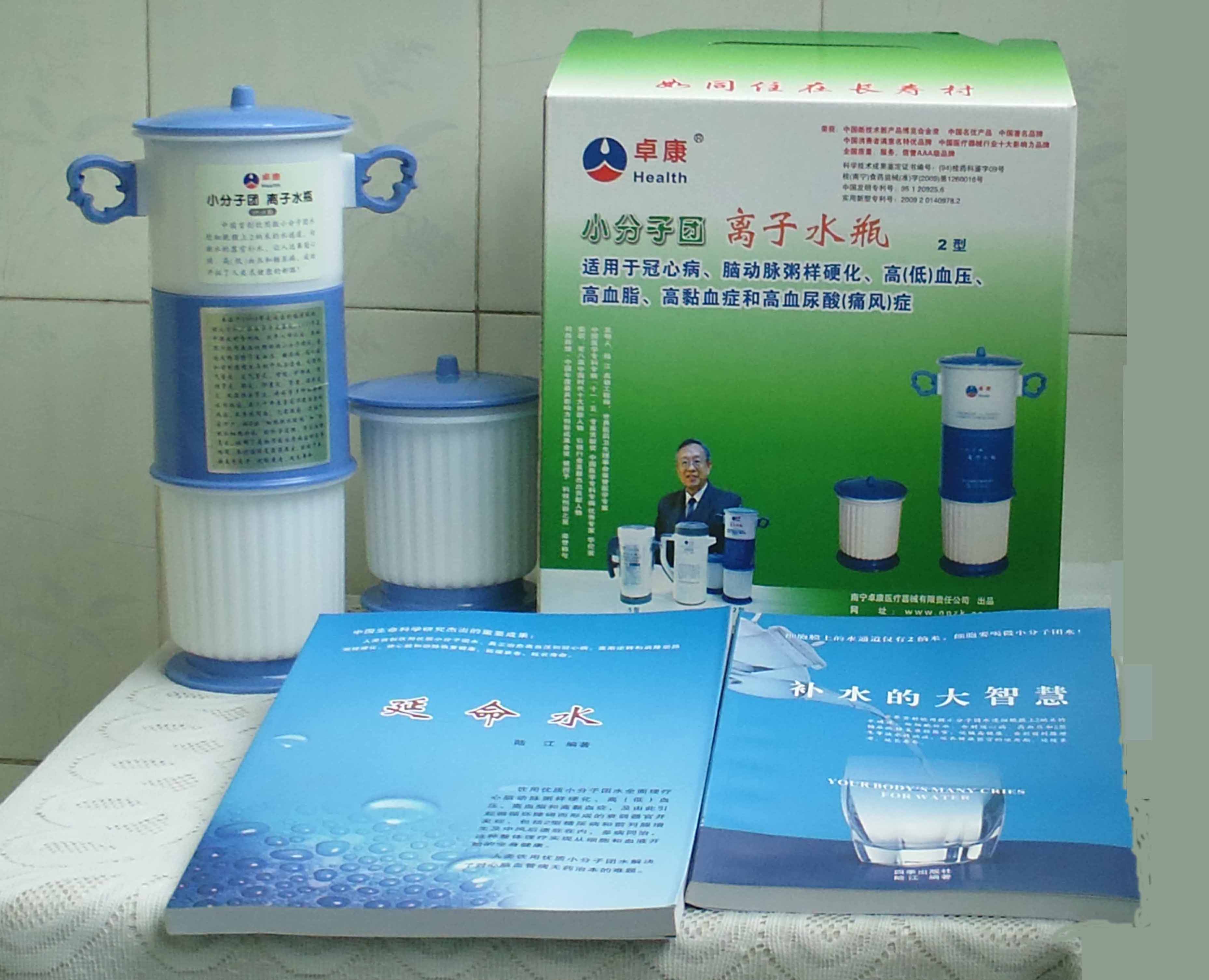 -----我是從事建筑的高工,本來(lái)沒(méi)有資格去攻克醫(yī)學(xué)難題,卻為了自身健康才扣響醫(yī)學(xué)的大門(mén)。由于我1990年患高血壓,因怕中風(fēng)才研究發(fā)明了離子水瓶,我把水處理成微小分子團(tuán)水,飲用后治愈了高血壓。便于1993年底送到三家省級(jí)醫(yī)院做臨床試用4個(gè)月。經(jīng)北京和廣西醫(yī)學(xué)專(zhuān)家鑒定:"降脂降壓效果好"," 能擴(kuò)大心腦動(dòng)脈流量,改善心腦電圖以及微循環(huán)","對(duì)治療心腦動(dòng)脈粥樣硬化、高血壓、高血脂有良好的醫(yī)療保健作用。""產(chǎn)品的技術(shù)性能和療效達(dá)到了同類(lèi)產(chǎn)品的國(guó)內(nèi)領(lǐng)先水平,經(jīng)廣西醫(yī)學(xué)科學(xué)情報(bào)研究所檢索,未見(jiàn)國(guó)外有類(lèi)似報(bào)道。"中國(guó)醫(yī)學(xué)科學(xué)院張正國(guó)教授從美國(guó)國(guó)立醫(yī)學(xué)圖書(shū)館數(shù)據(jù)庫(kù)存Medline檢索英俄文資料,均未見(jiàn)類(lèi)似報(bào)告。2000年上市后,我為了對(duì)消費(fèi)者負(fù)責(zé)而繼續(xù)觀察研究,一直通過(guò)《信譽(yù)卡》和《質(zhì)量跟蹤調(diào)查書(shū)》向患者承諾療效,請(qǐng)用戶(hù)使用6個(gè)月后反饋效果。和脂壓患者飲用2至5個(gè)月內(nèi),消除癥狀,停服藥物,血壓正常;冠心病患者飲用3~5個(gè)月逐漸減輕至消除心絞痛、房顫等癥狀,不再服藥,飲用1年左右心電圖正常,經(jīng)冠脈造影掃描無(wú)明顯狹窄,表明冠心病痊愈。大量患者還反映許多衰弱器官被修復(fù),讓前列腺增生、慢性咽喉炎、慢性氣管炎、支氣管炎、慢性胃炎、腸炎和膽囊炎等不藥而愈;2型糖尿病患者是因?yàn)橐葝u衰弱致病,飲用該水半年至一年,逐漸減藥至停藥,血糖尿糖正常,真正治愈2型糖尿病。中風(fēng)后遺癥患者飲用六七個(gè)月,可逐漸減輕至消除肢體和語(yǔ)言障礙,表明飲用該水能讓壽命很長(zhǎng)的神經(jīng)元細(xì)胞逐漸修復(fù),奇跡般地恢復(fù)肢體和語(yǔ)言功能。飲用后還使胸腺和脾臟兩個(gè)重要的免疫器官被修復(fù)和增強(qiáng),產(chǎn)生免疫細(xì)胞多,提高了免疫力,使人不生病或少生病。自此, 飲用微小分子團(tuán)水創(chuàng)造了攻克冠心病、高(低)血壓和糖尿病三大醫(yī)學(xué)難題的奇跡。人們對(duì)此感到不可思議,但實(shí)踐是檢驗(yàn)真理的唯一標(biāo)準(zhǔn)。