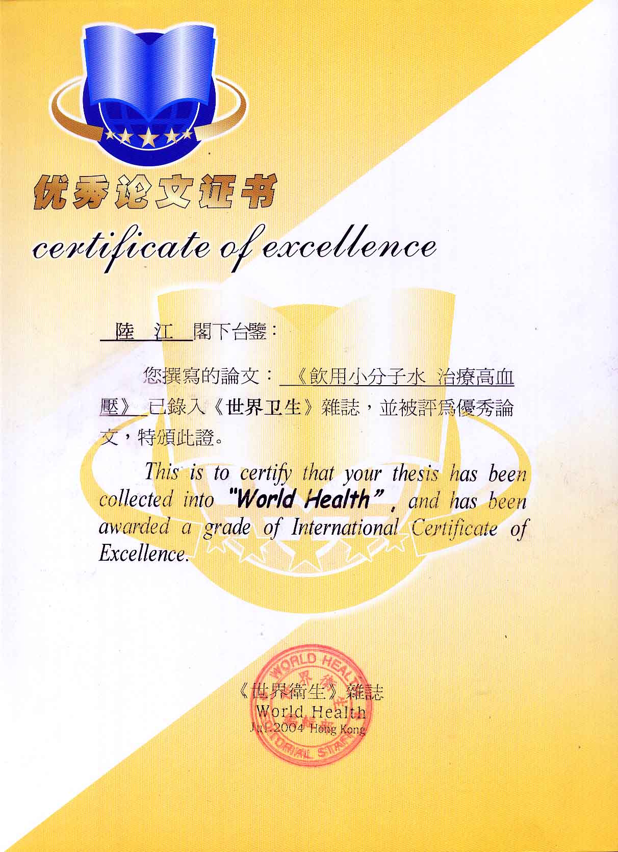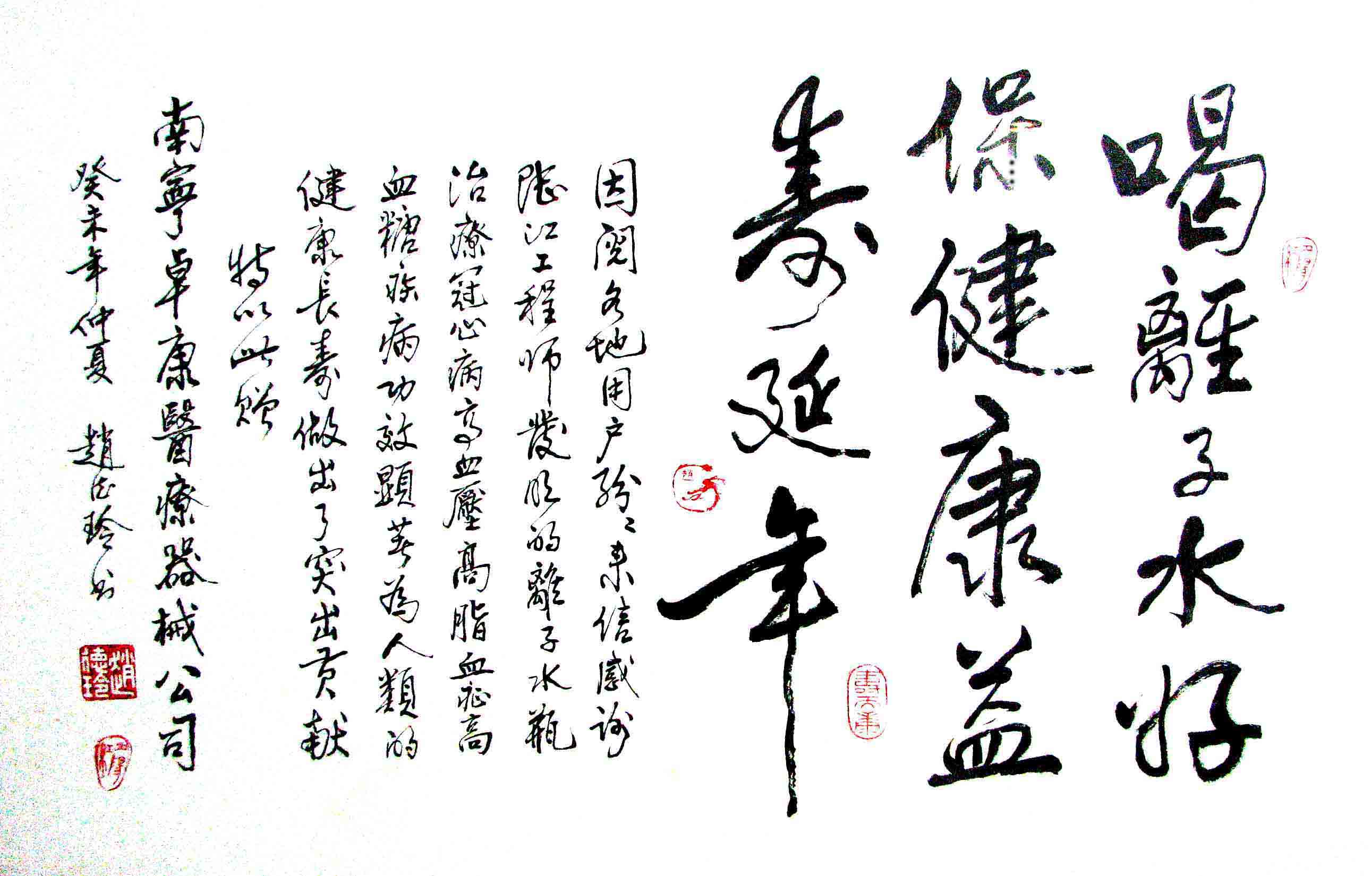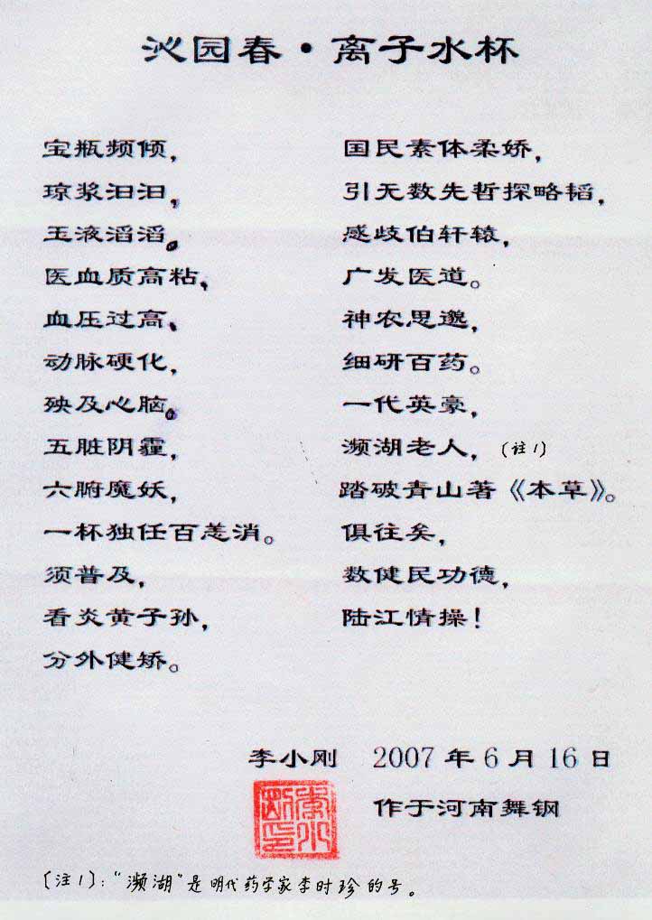-----我是從事建筑的高工,本來(lái)沒(méi)有資格去攻克醫(yī)學(xué)難題,卻為了自身健康才扣響醫(yī)學(xué)的大門(mén)。由于我1990年患高血壓,因怕中風(fēng)才研究發(fā)明了離子水瓶,我把水處理成微小分子團(tuán)水,飲用后治愈了高血壓。便于1993年底送到三家省級(jí)醫(yī)院做臨床試用4個(gè)月。經(jīng)北京和廣西醫(yī)學(xué)專(zhuān)家鑒定:"降脂降壓效果好"," 能擴(kuò)大心腦動(dòng)脈流量,改善心腦電圖以及微循環(huán)","對(duì)治療心腦動(dòng)脈粥樣硬化、高血壓、高血脂有良好的醫(yī)療保健作用。""產(chǎn)品的技術(shù)性能和療效達(dá)到了同類(lèi)產(chǎn)品的國(guó)內(nèi)領(lǐng)先水平,經(jīng)廣西醫(yī)學(xué)科學(xué)情報(bào)研究所檢索,未見(jiàn)國(guó)外有類(lèi)似報(bào)道。"中國(guó)醫(yī)學(xué)科學(xué)院張正國(guó)教授從美國(guó)國(guó)立醫(yī)學(xué)圖書(shū)館數(shù)據(jù)庫(kù)存Medline檢索英俄文資料,均未見(jiàn)類(lèi)似報(bào)告。2000年上市后,我為了對(duì)消費(fèi)者負(fù)責(zé)而繼續(xù)觀察研究,一直通過(guò)《信譽(yù)卡》和《質(zhì)量跟蹤調(diào)查書(shū)》向患者承諾療效,請(qǐng)用戶(hù)使用6個(gè)月后反饋效果。和脂壓患者飲用2至5個(gè)月內(nèi),消除癥狀,停服藥物,血壓正常;冠心病患者飲用3~5個(gè)月逐漸減輕至消除心絞痛、房顫等癥狀,不再服藥,飲用1年左右心電圖正常,經(jīng)冠脈造影掃描無(wú)明顯狹窄,表明冠心病痊愈。大量患者還反映許多衰弱器官被修復(fù),讓前列腺增生、慢性咽喉炎、慢性氣管炎、支氣管炎、慢性胃炎、腸炎和膽囊炎等不藥而愈;2型糖尿病患者是因?yàn)橐葝u衰弱致病,飲用該水半年至一年,逐漸減藥至停藥,血糖尿糖正常,真正治愈2型糖尿病。中風(fēng)后遺癥患者飲用六七個(gè)月,可逐漸減輕至消除肢體和語(yǔ)言障礙,表明飲用該水能讓壽命很長(zhǎng)的神經(jīng)元細(xì)胞逐漸修復(fù),奇跡般地恢復(fù)肢體和語(yǔ)言功能。飲用后還使胸腺和脾臟兩個(gè)重要的免疫器官被修復(fù)和增強(qiáng),產(chǎn)生免疫細(xì)胞多,提高了免疫力,使人不生病或少生病。自此, 飲用微小分子團(tuán)水創(chuàng)造了攻克冠心病、高(低)血壓和糖尿病三大醫(yī)學(xué)難題的奇跡。人們對(duì)此感到不可思議,但實(shí)踐是檢驗(yàn)真理的唯一標(biāo)準(zhǔn)。