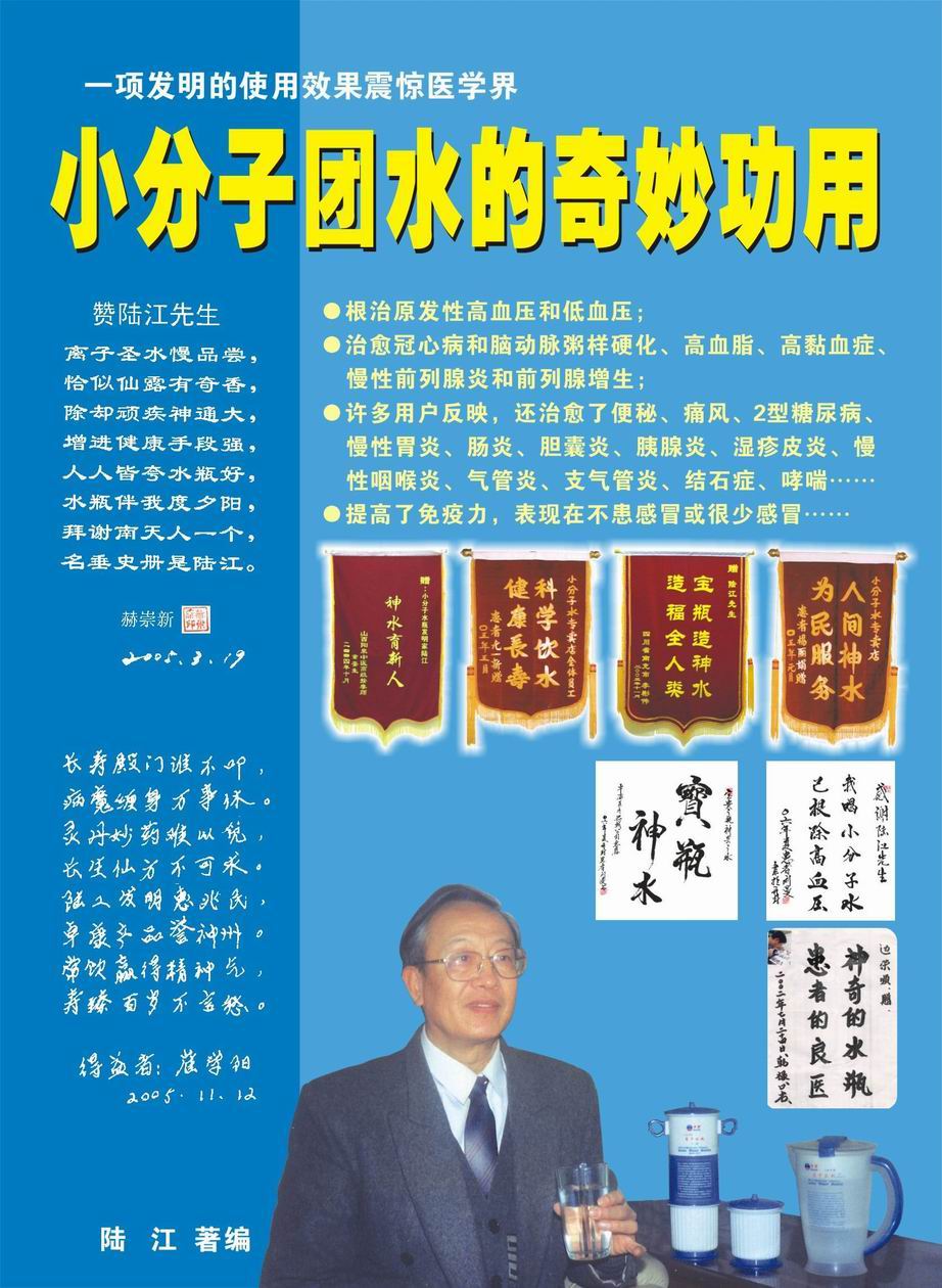 人類(lèi)幾千年來(lái)患以上病癥需終生服藥,幾十年也不能治愈??墒俏覈?guó)南寧的高級(jí)工程師陸 江,于1990年想根治高血壓,研究發(fā)明了離子水瓶,處理出微小分子團(tuán)水供飲用,經(jīng)過(guò)醫(yī)院臨床試用和專(zhuān)家鑒定,1999年獲中國(guó)發(fā)明專(zhuān)利權(quán),產(chǎn)品于2000年投放市場(chǎng)后一直跟蹤調(diào)查,據(jù)全國(guó)各地用戶(hù)反饋:祛除了高低血壓、糖尿病和冠心病,并使前列腺增生、咽喉炎、鼻竇炎、慢性氣管炎、支氣管炎、矽肺病、哮喘、慢性胃炎、腸炎、慢性膽囊炎、慢性腎炎、腎衰、膀胱炎、便秘、痔瘡、風(fēng)濕性關(guān)節(jié)炎和濕疹皮炎及中風(fēng)后遺癥等病癥不藥而愈。為什么喝微小水能治20多種病?陸 江從1991年德國(guó)科學(xué)家發(fā)現(xiàn)細(xì)胞膜水通道僅為2納米獲得啟發(fā),認(rèn)為多種器官患病是因細(xì)胞脫水,不能正常代謝和分裂增殖,才使器官細(xì)胞減少致衰弱萎縮而形成細(xì)胞缺水性病癥。22年來(lái)的實(shí)踐有力地支持了“細(xì)胞脫水致病”這一重要論點(diǎn),表明喝微小水可滿(mǎn)足細(xì)胞的生理需求,補(bǔ)水就能祛病,是生命科學(xué)新亮點(diǎn)。